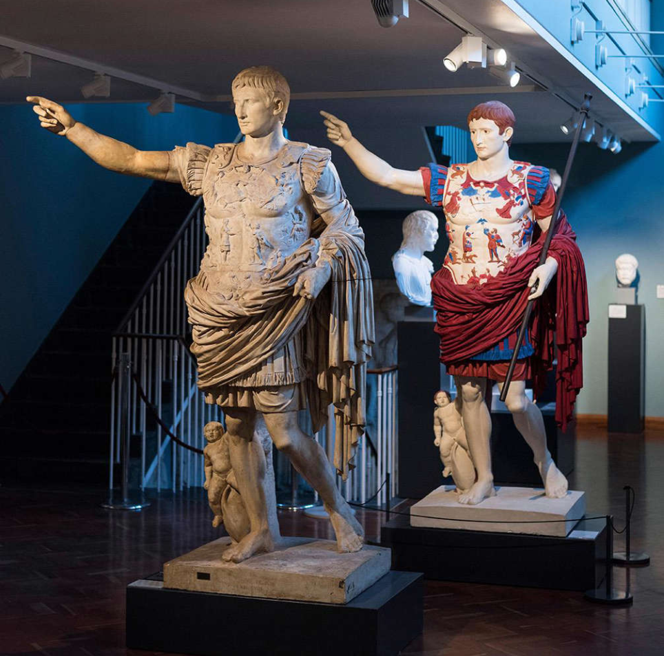 Această fotografie prezintă o statuie faimoasă a primului împărat roman, Augustus, lângă o replică care prezintă ceea ce ne imaginăm că au fost culorile sale originale. Rezultatul este mai puțin „clasic”.